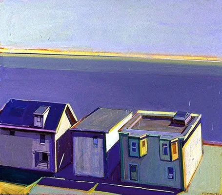 In the photos below, the artist, Richard Diebenkorn, has tried to capture the sense of the place where he was living at the time. He would work in series and these particular abstracts were done in Berkeley, California and Albuquerque, New Mexico. You can see the color differences immediately. Berkeley has more vegetation, is cooler, and is close to the San Francisco Bay. Albuquerque has more open space with the desert surrounding it as well as the colors of sand, clay and the feeling of heat.