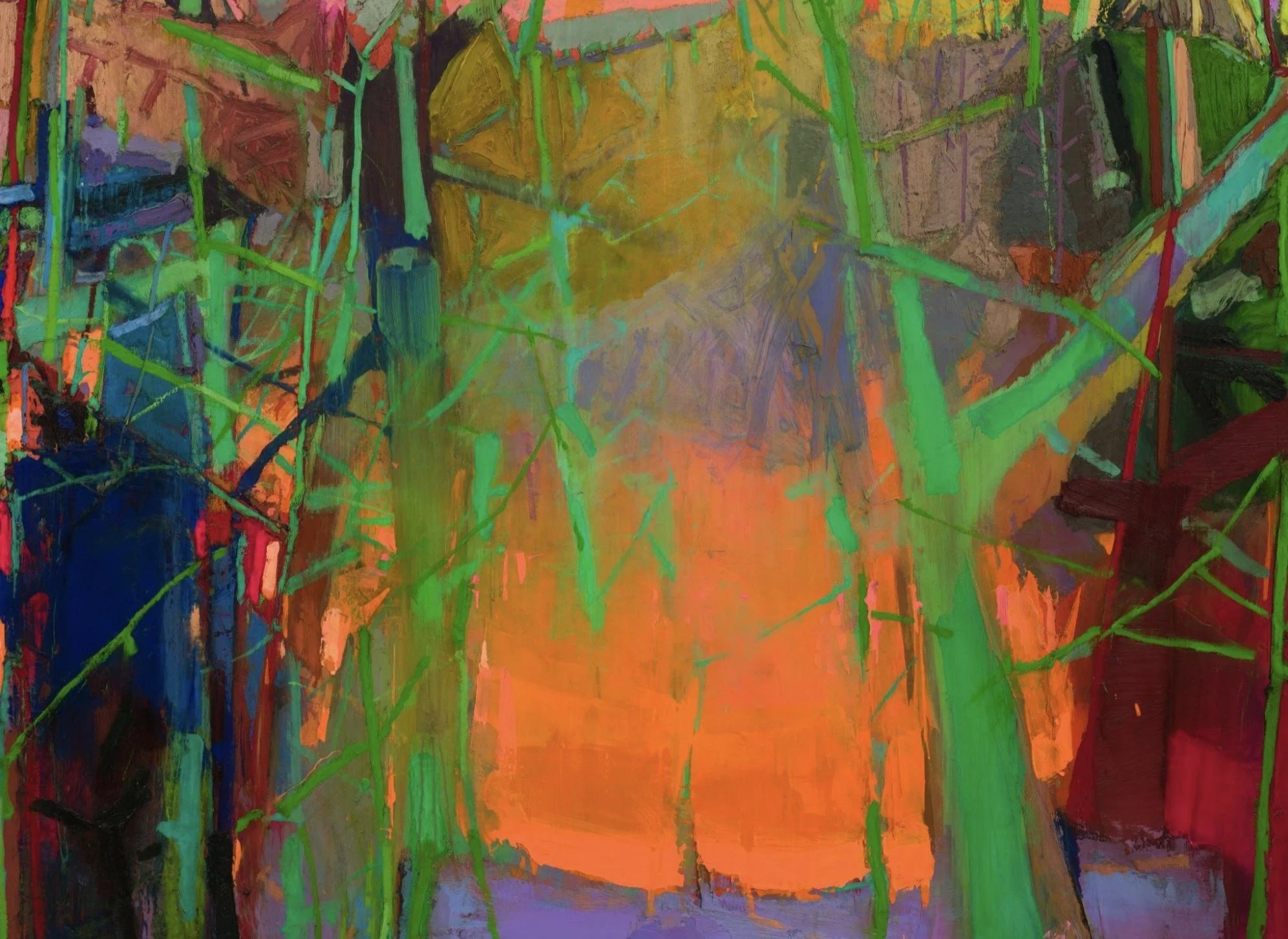 Look at the high chroma (intense/saturated) colors of the Raimond Staprans red and green in comparison to the muted reds and greens of the Wolf Kahn forest in the Complementary Gallery. The chroma creates a completely different mood in each.
